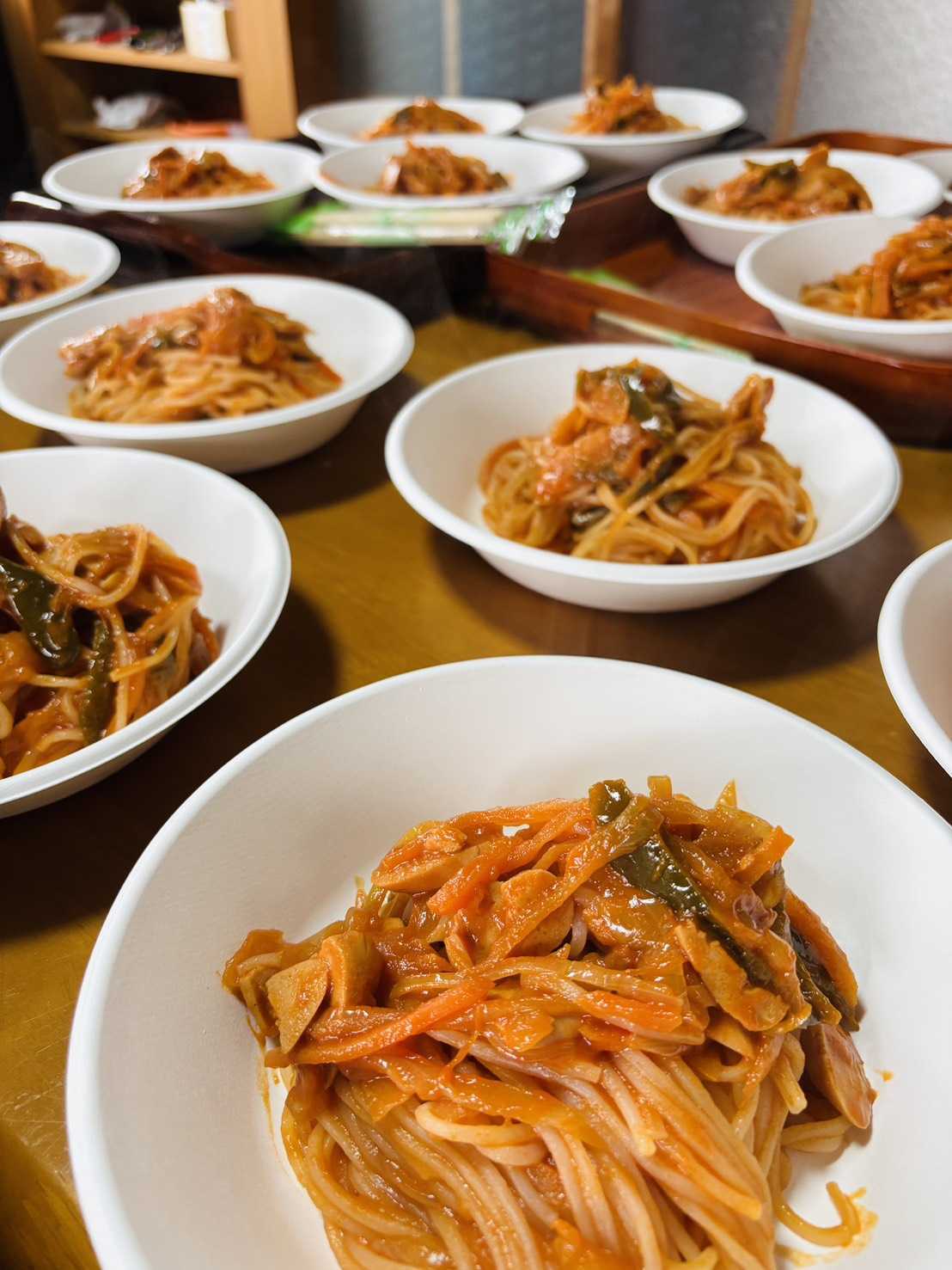 お昼には、地元名物「おこめんナポリタン」を囲み、大学生と子どもたちが交流。
